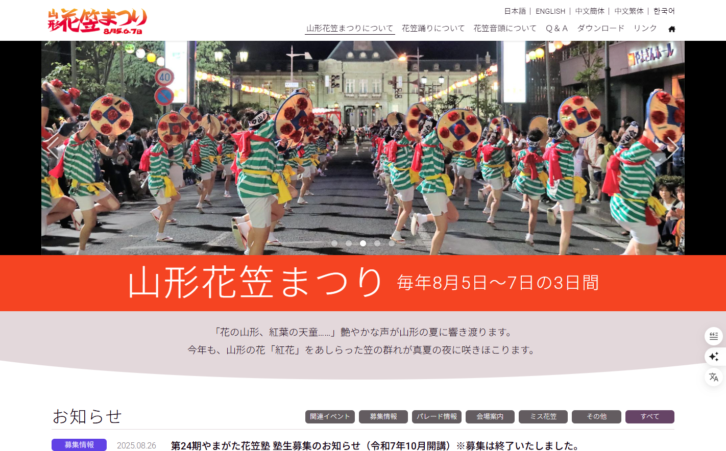イベント一覧 カテゴリ(すべて) アート・展示 お祭り グルメ スポーツ その他 ビジネス マルシェ 交流・コミュニティ 体験・ワークショップ 健康・美容 地域イベント 季節行事 学び・講座 音楽 地域(すべて) 山形市 酒田市 季節(すべて) 10月 11月 12月 1月 2月 3月 4月 5月 6月 7月 8月 9月 冬 夏 春 秋 通年開催 属性(すべて) アットホーム イベント内容 オンライン シニア向け ディナー トーク・交流 ランチ 一人参加OK 体験型 初心者歓迎 夜開催 大人向け 女性向け 子供向け 学べる 学生向け 定期・特別枠 定期開催 対象・年齢層 少人数制 屋内 屋外 有料掲載 期間限定 本格派 注目イベント 見学OK 親子向け 開催形式 雨天決行 雰囲気・参加しやすさ 飲み会あり 飲食・時間帯 飲食あり 高校生向け 検索 リセット 終了イベントも表示 先の予定を非表示 花笠まつり 2026/08/05 体験・ワークショップ 「花の山形、紅葉の天童……」艶やかな声が山形の夏に響き渡ります。 今年も、山形の花「紅花」をあしらった笠の群れが真夏の夜に咲きほこります。 あけましておめでとうございます。 2027/01/01 その他